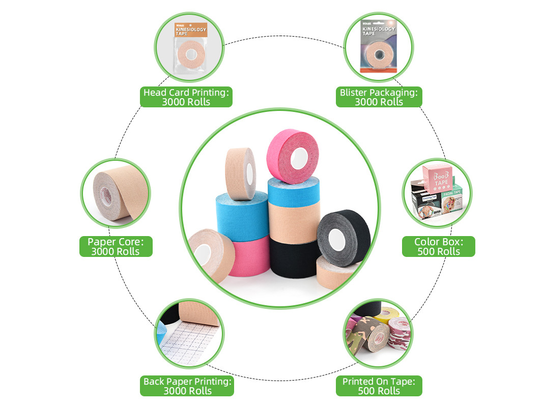 We provide a variety of custom options, including private-label kinesiology tape and custom colors, with flexible MOQs to suit your needs. The following list illustrates the MOQs for different customization requirements, using our 5cm kinesiology tape as an example: